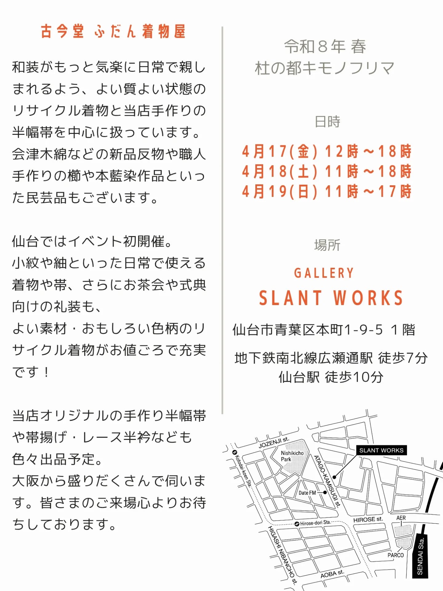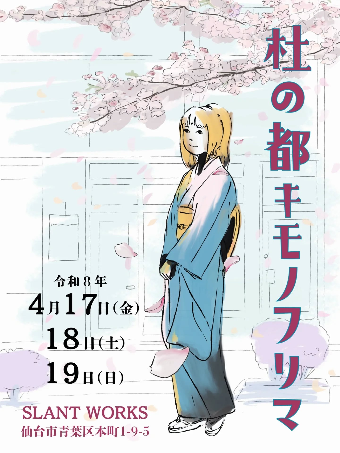 - 2026-02-12【仙台 #杜の都キモノフリマ 開催のお知らせ】 桜前線の北上とともに今年も東北へ。仙台にて初開催いたします。